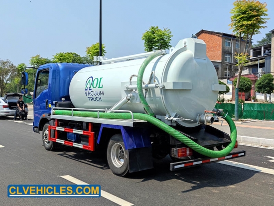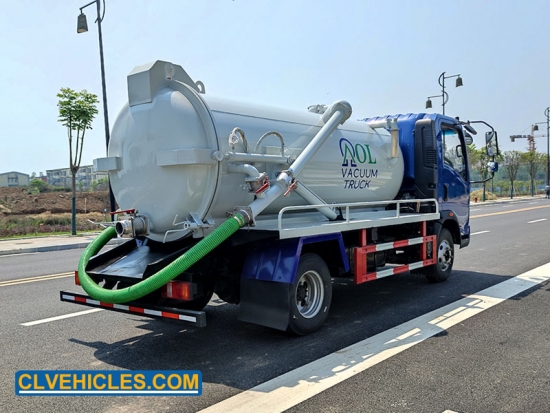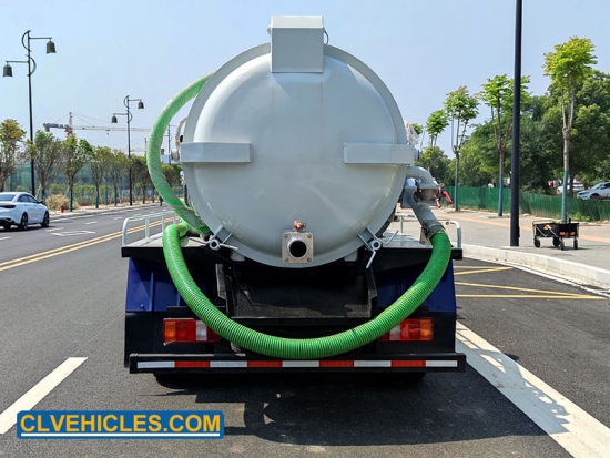 El camión de succión está equipado con una ventana de inspección de nivel y un puerto de autoflujo, un dispositivo de lavado de manos, una válvula antidesbordamiento, una tubería de succión de 8 metros, una apertura hidráulica de la puerta trasera y una bomba de vacío de circulación de agua SK-15. El camión de succión tiene una gran carrera y succión. Además, el tanque cuenta con una función de elevación.